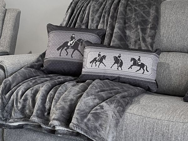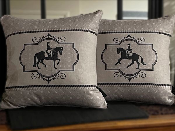 These cushions feature stunning black and grey colours and patterns, elegantly adorned with custom-drawn horse designs and Fleur De Lis Motifs. Crafted from luxurious velvet fabric, they are beautifully finished with a dense, plump microfiber insert, ensuring both comfort and style for any space.